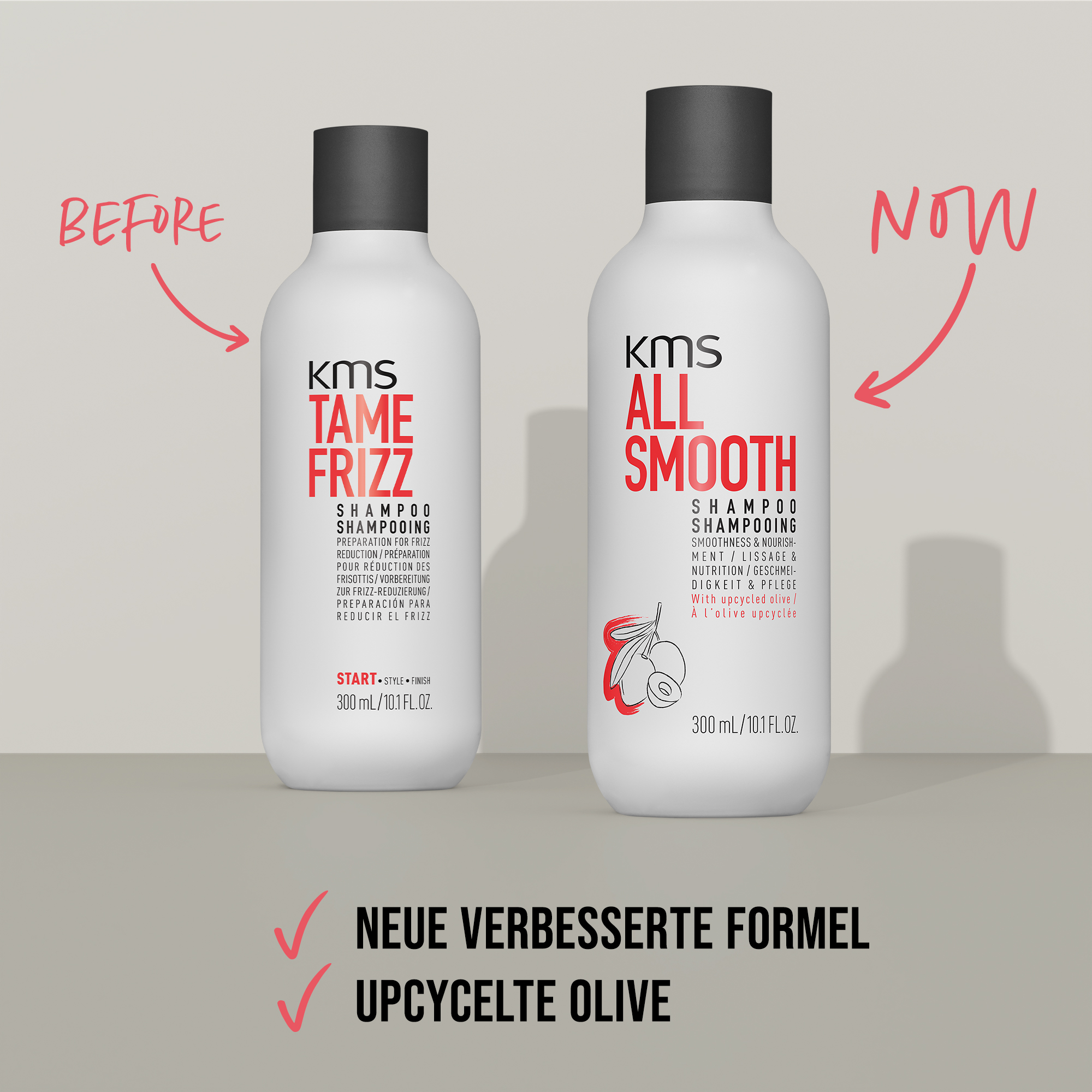 Aus Tamefrizz wird Allsmooth die Serie bleibt deine Intensive Anti-Frizz Pflege für krauses, trockenes Haar –glättet, nährt und entwirrt. Diese schwerelose Leave-in-Pflege bleibt im Haar, macht es es spürbar geschmeidiger, verbessert die Kämmbarkeit und das Beste, Sie hat einen Hitzeschutz bis 230°C , ideal für das Styling mit Glätteisen oder Föhn. WAS IST DAS BESONDERE?ENTWIRREN• Bis zu 3x leichteres entwirren.• 2x glatteres Haar!• Sofort bessere Kämmbarkeit.• Verbessert direkt die Formbarkeit.• Hinterlässt spürbar weiches, glattes und glänzendes Haar.FRIZZ-KONTROLLE• Bändigt Frizz und fliegende Haare.ANTISTATISCH• Versiegelt die Haarspitzen und die Schuppenschicht – schützt vor Luftfeuchtigkeit & Frizz.• Antistatische Wirkung.• Verleiht Glanz.• Hitzeschutz bis zu 230 °C für Stylings mit Hot Tools.Upgecycelte Olive – ist bekannt für ihren hohen Gehalt an Antioxidantien, wie Vitamin E und hilft das Haar vor Umwelteinflüssen und oxidativem Stress zu schützen, die zu Trockheit und Brüchigkeit führen können.Formuliert ohne SLS/SLES-Sulfate2, Mineralöle, Silikone, Farbstoffe oder PEGs.Für alle Haartypen. Ideal für feines bis starkes Haar, das bessere Kämmbarkeit, Glätte und Frizz-Kontrolle benötigt.Anwendung:In handtuchtrockenes Haar einarbeiten, föhnen oder lufttrocknen lassen und wie gewohnt stylen.KMS Allsmooth Smoothing Lotion 150mlEAN: 4044897040110