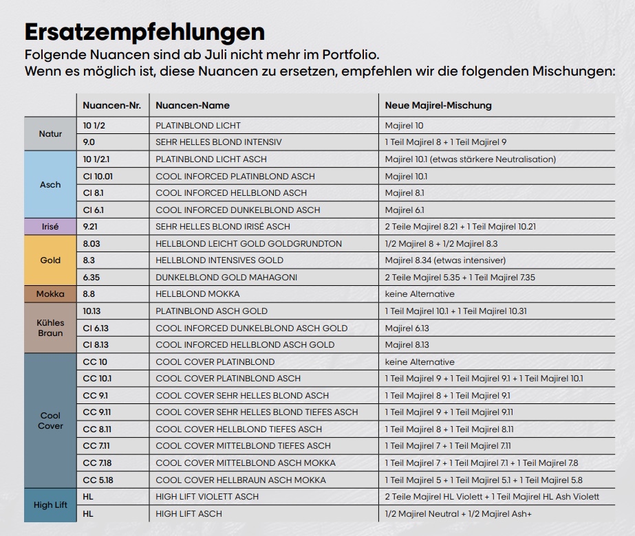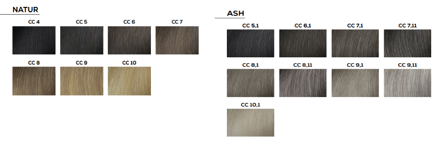 | couleur: | 4 mittelbraun, 4,3 mittelbraun Goldbeige, 5 hellbraun, 5,1 hellbraun asch, 5,3 hellbraun Goldbeige, 5,18 hellbraun Asch Mokka, 6 Dunkelblond, 6,1 Dunkelblond Asch, 6,3 Dunkelblond Goldbeige, 7 Mittelblond, 7,1 Mittelblond Asch, 7,3 Mittelblond Goldbeige, 7,11 Mittelblond tiefes Asch , 7,18 Mittelblond Asch Mokka, 7,82 CC MITTELBLOND MOKKA IRISÉ, 8 Hellblond, 8,1 Hellblond Asch, 8,3 Hellblond Goldbeige, 8,11 Hellblond tifes Asch, 9 sehr helles blond, 9,1 sehr helles blond Asch, 9,11 sehr helles blond tiefes Asch, 9,82 SEHR HELLES BLOND MOKKA IRISÉ, 10 Platinblond, 10,1 Platinblond Asch |